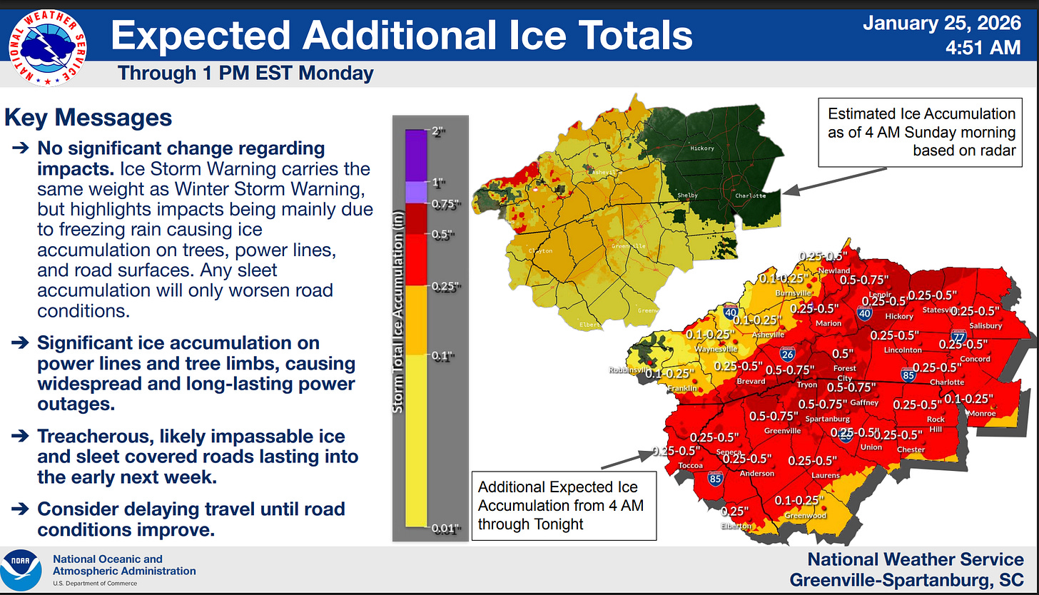 Precipitation began to accumulate across Charlotte overnight, and most of the region is forecast to receive between 0.25 and 0.5 inches of ice. That’s a downgrade from initial projections, but it's still dangerous enough to cause widespread, long-lasting power outages.