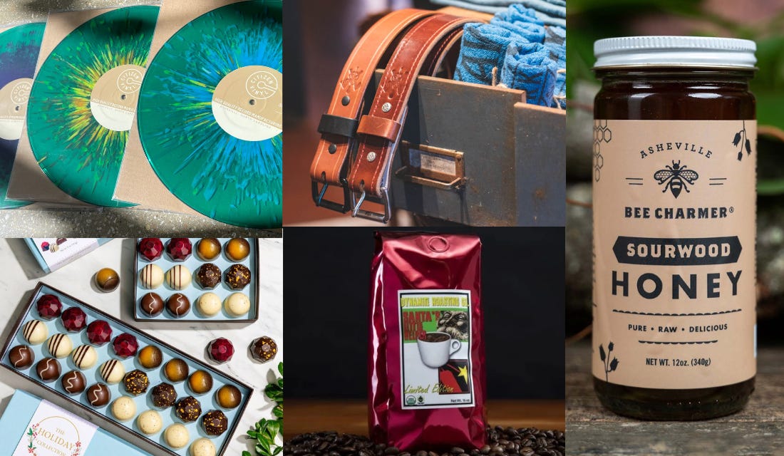 A few shippable holiday gift ideas from Western North Carolina include (clockwise from top left) a vinyl record from Citizen Vinyl, a custom leather belt from Axel and Awl Leatherworks, a jar of Sourwood honey from Asheville Bee Charmer, a bag of holiday whole coffee beans from Dynamite Roasting and a box of Holiday chocolate bonbons from French Broad Chocolate.