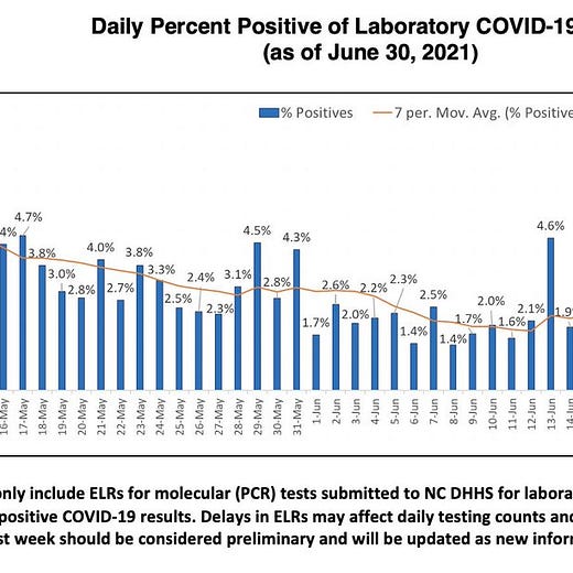 As recently as last week, health director Gibbie Harris was warning about the possibility of the virus spreading during Fourth of July gatherings, especially with the recent arrival of the “Delta variant,” which is thought to be more contagious. She has consistently warned about the possible dangers of holiday gatherings since the start of the pandemic, even as all Covid numbers have been declining from their January peaks: “We didn’t have any major bumps or issues after Memorial Day, which is great, but we know with other holiday weekends we have seen increases, so we’ll just have to watch and see,” Harris said last week, according to WCNC.