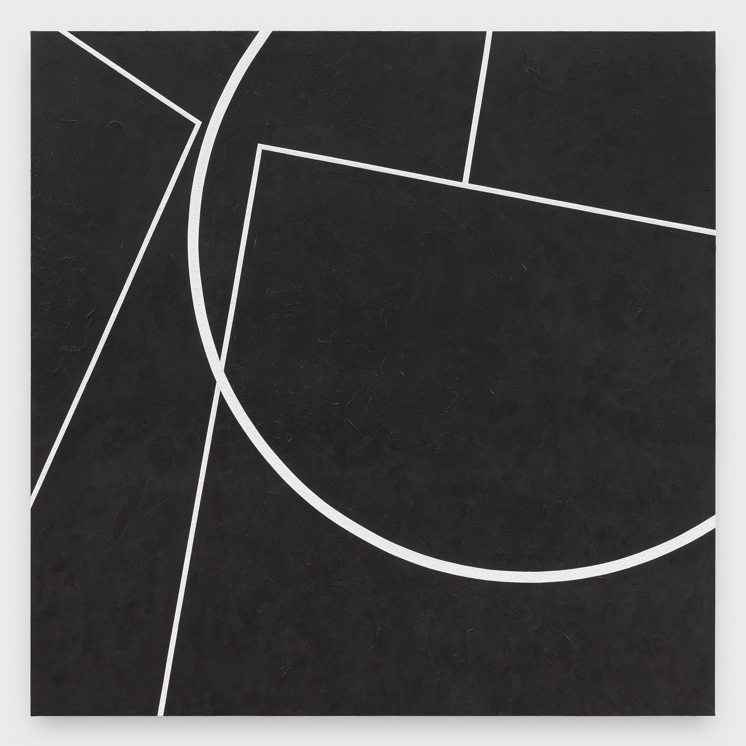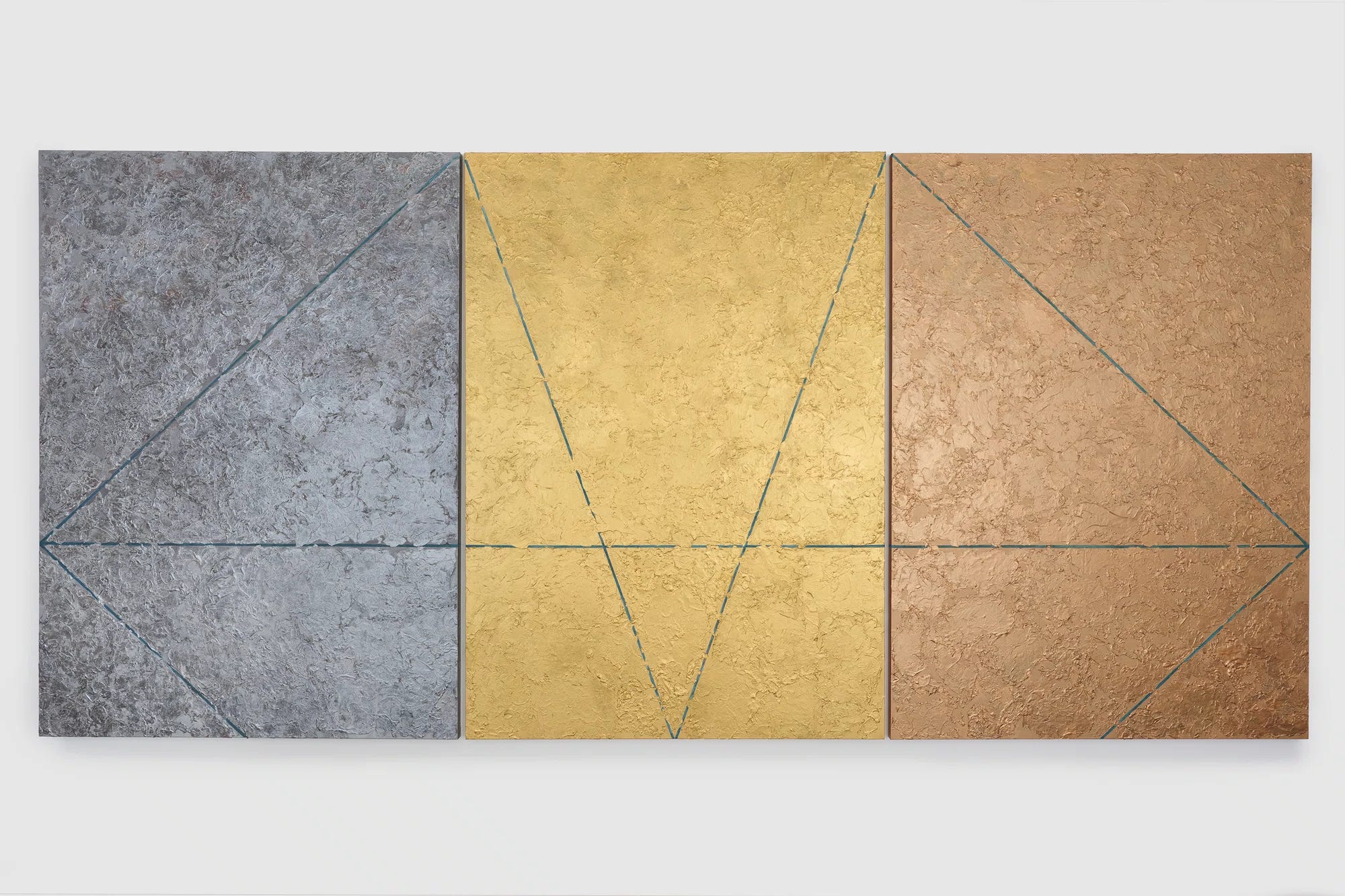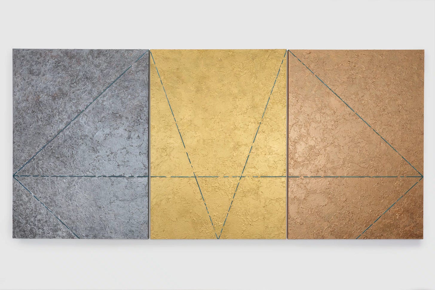 In the last room, Jaramillo sums up her career with recent, more monumental works full of her trademarks: black, nubbly backgrounds, horizontal lines as shimmering horizons, circles and curved lines — now often incomplete, like shooting stars — blocks of color juxtaposing brilliant blue and calming gray. Sections colored like copper, gold and tin hang side by side in the wide, seemingly metallic “To Touch the Earth.”